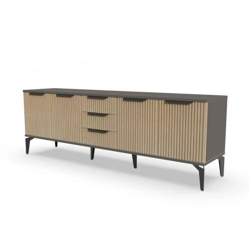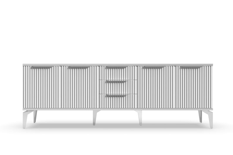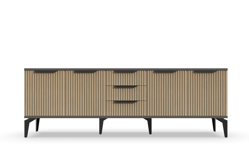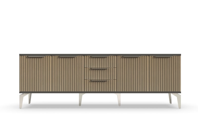 Тумба под телевизор "Рейн" является идеальным дополнением к любому современному интерьеру. Она имеет практичный дизайн, который позволяет хранить различные предметы и украшения, при этом оставаясь удобной и функциональной. Рифлёные поверхности придают тумбе уникальный и стильный вид, который будет выглядеть превосходно в вашей гостиной или гостевой комнате.