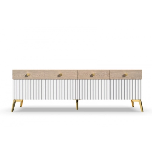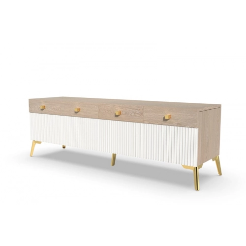 Тумба под ТВ Темпо имеет просторную полку для размещения телевизора и два ящика для хранения различных предметов, таких как кабели, диски и пульты дистанционного управления. Рифленые поверхности на фасадах ящиков добавляют оригинальности и стиля этой тумбы.